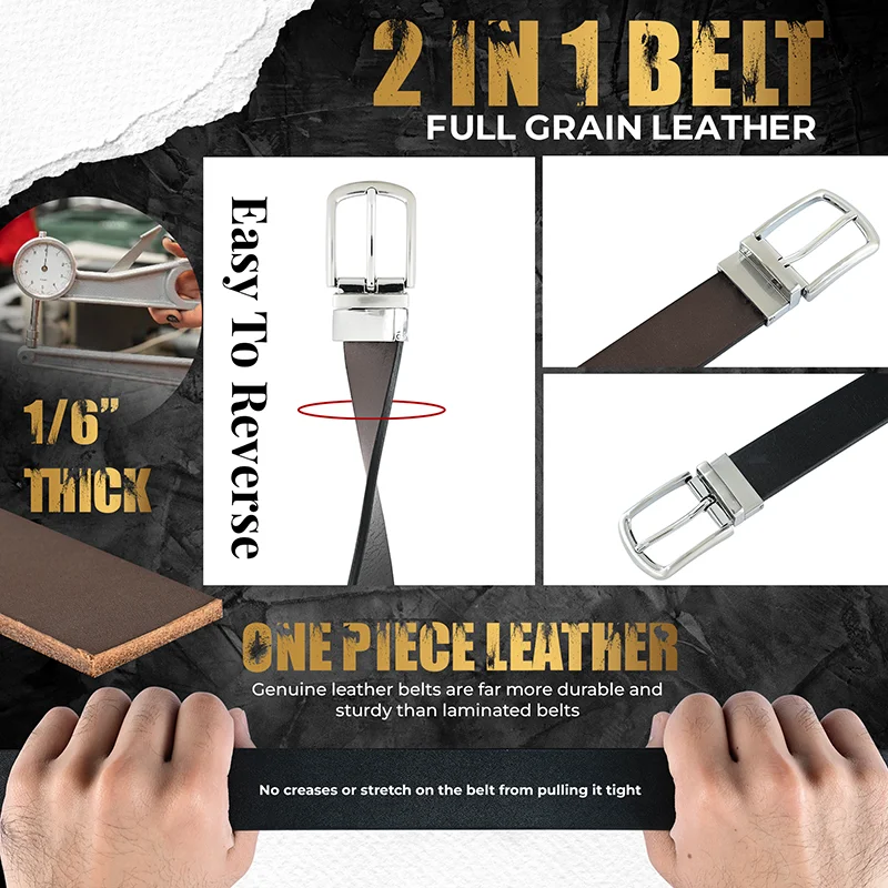 Upgrade your wardrobe with our premium 2-in-1 Reversible Leather Belt, designed for ultimate versatility and durability. Made from 100% solid one-piece leather, this belt offers two distinct colors in one: a sleek black leather belt and a rich brown leather belt. Whether you need a formal look or a casual touch, this reversible leather belt has you covered for any occasion.